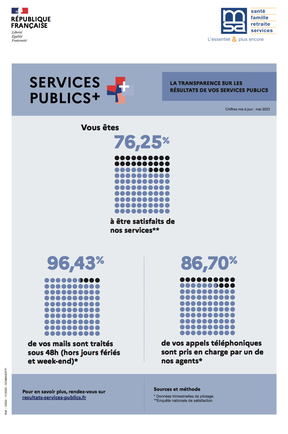 Votre satisfaction est mesurée régulièrement. La publication de nos indicateurs de qualité de service est trimestrielle. Les résultats sont consultables ci-après ainsi que dans votre agence MSA.